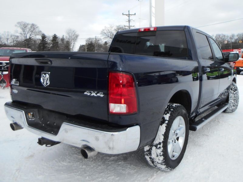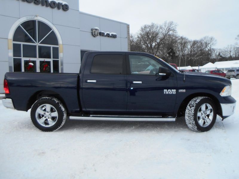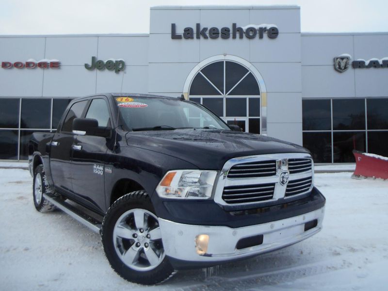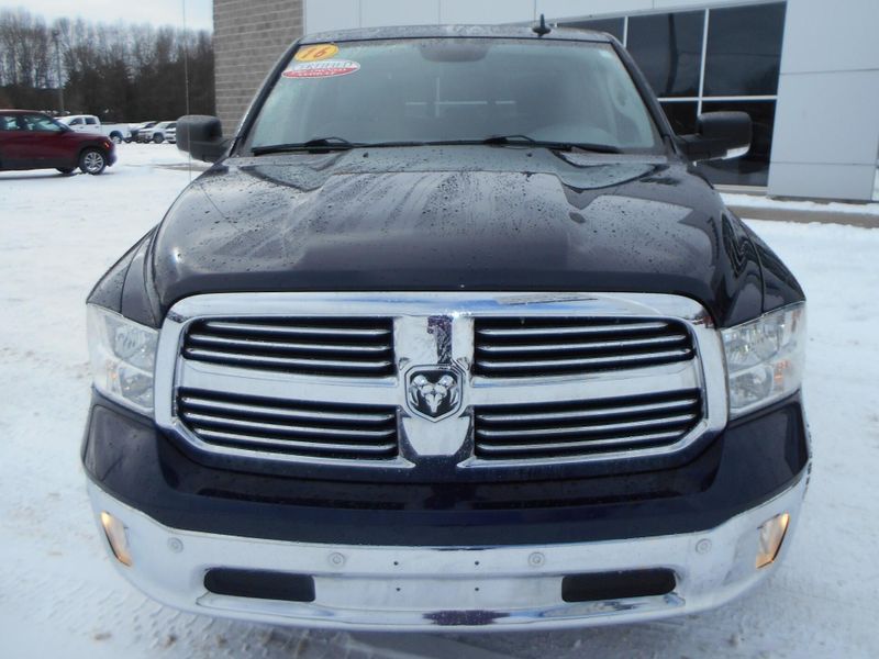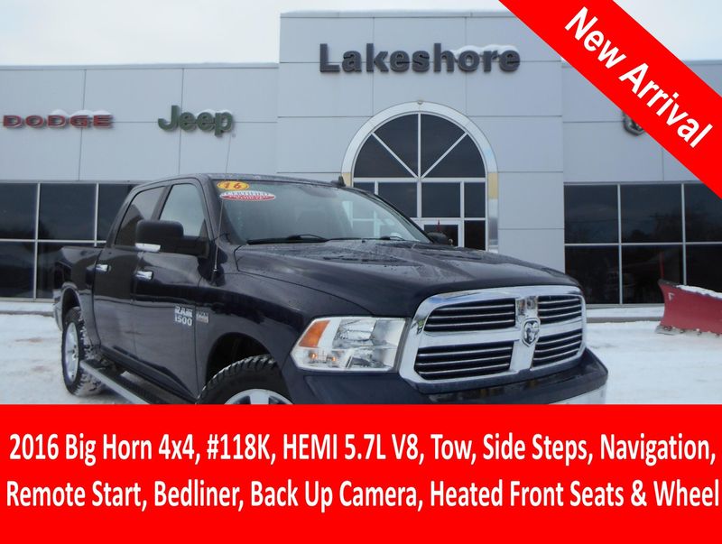 Clean CARFAX 2016 Ram 1500 Big Horn in True Blue Pearlcoat with just over 118,000 miles on the odometer. Features HEMI 5.7L V8, navigation, tow, remote start, power folding mirrors, rear step bumper, 8.4'' touchscreen display, spray in bedliner, wheel to wheel side steps, remote start, universal garage door opener, integrated voice command w/Bluetooth, parkview rear back-up camera, heated seats and wheel. All of our vehicles have been safety inspected and reconditioned. Each get a professional interior fabric cleaning as well as an exterior detail. Call/text Justin Morrell Used Car Sales Manager 231-690-2679 for more information.