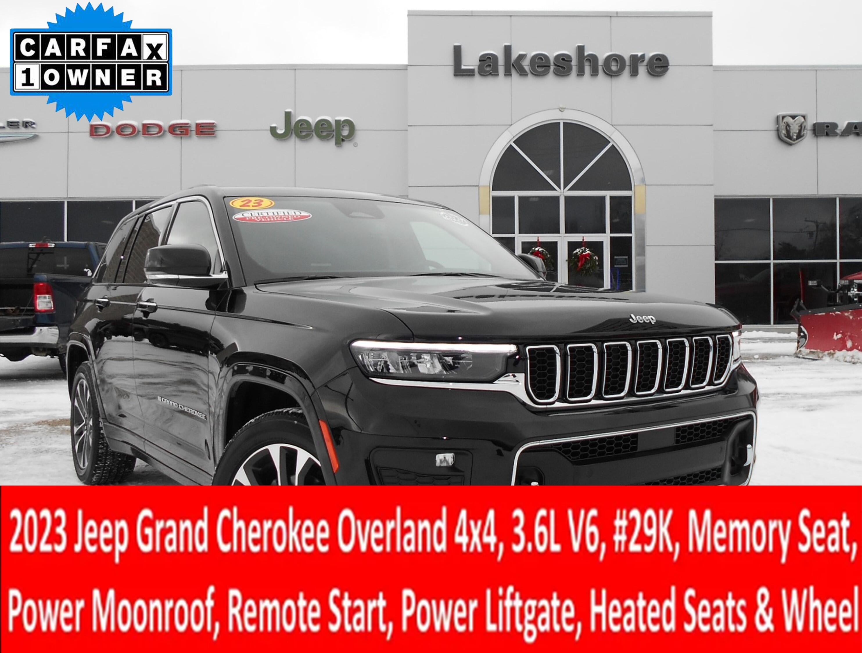 One Owner 2023 Jeep Grand Cherokee Overland 4x4 in Diamond Black Crystal Pearlcoat with just under 29,000 miles on the odometer. Features 3.6L V6, power moonroof, navigation, power liftgate, garage door transmitter, memory seat, power front seats, garage door transmitter, 2nd-row manual window shades, heated seats and wheel. All of our vehicles have been safety inspected and reconditioned. Each get a professional interior fabric cleaning as well as an exterior detail. Call/text Justin Morrell Used Car Sales Manager 231-690-2679 for more information.
