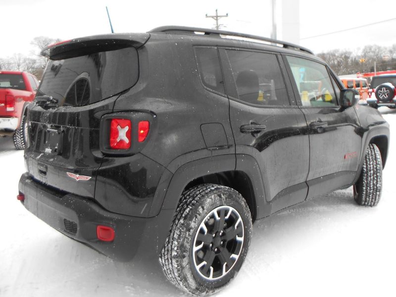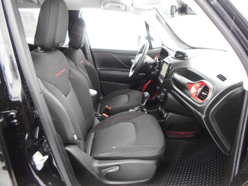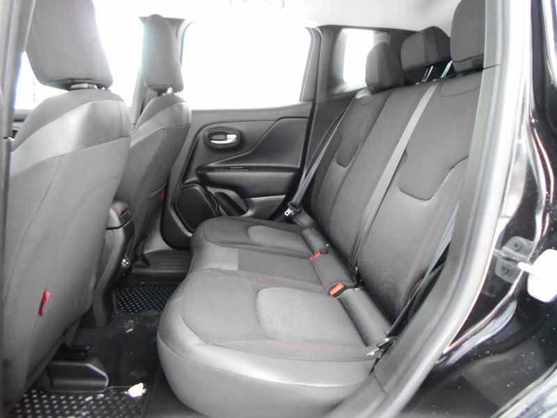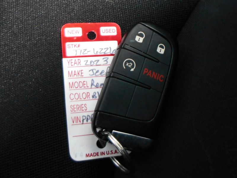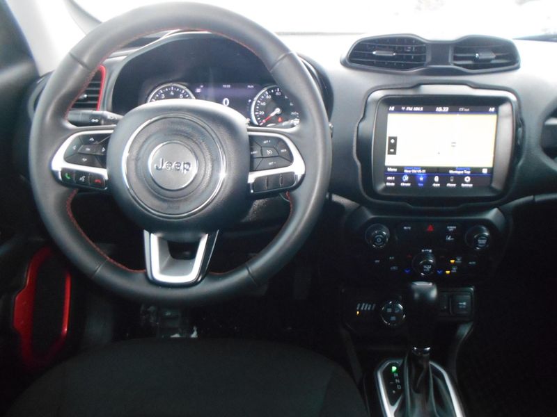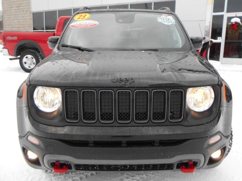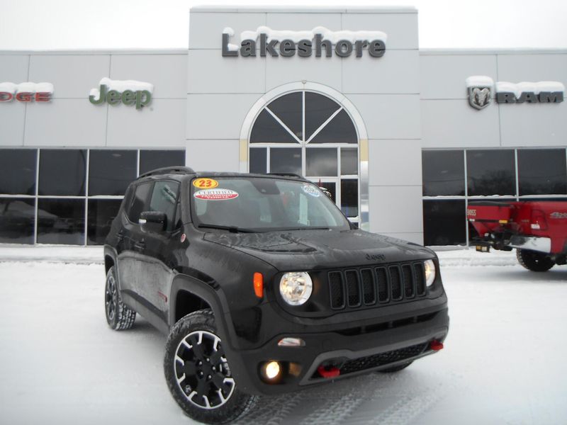 One Owner 2023 Jeep Renegade Trailhawk 4x4 in Black Clearcoat with just over 24,000 miles on the odometer. Features 1.3L I4, navigation, fully automatic lights, Apple CarPlay/Android Auto, roof rack, parkview rear back-up camera, and steering wheel mounted audio controls. All of our vehicles have been safety inspected and reconditioned. Each get a professional interior fabric cleaning as well as an exterior detail. Call/text Justin Morrell Used Car Sales Manager 231-690-2679 for more information.